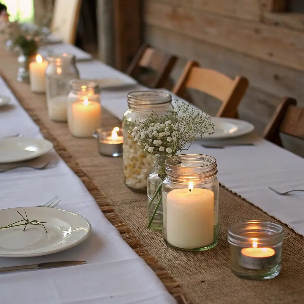 The key to making mason jar centerpieces feel fresh and minimalist rather than rustic-overdone? Keep it simple. Fill them with water, drop in a floating candle, and call it a day. Or wrap them with thin twine at the rim – just once around, none of that mummy-wrapped nonsense. The glass catches and reflects the candlelight beautifully, creating this gorgeous glow across your tables.
