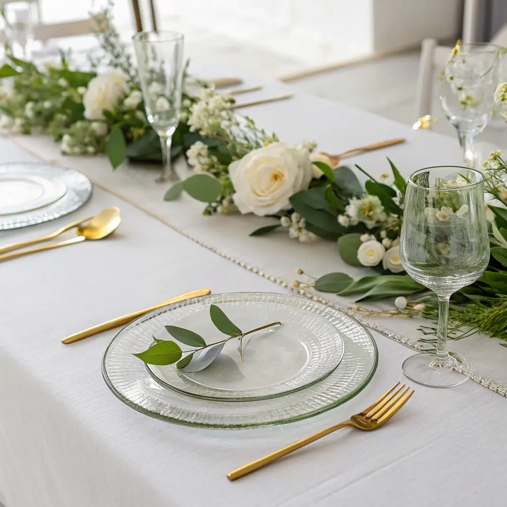The trick to nailing this look? Restraint with the gold. We’re talking gold-rimmed glasses, maybe gold flatware, or thin gold chargers under clear plates. Too much gold and you’ve crossed into Vegas territory. The clear glass keeps everything feeling fresh and modern while the gold adds just enough warmth and luxury.