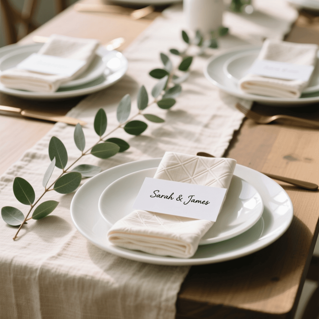 I recently helped style a micro-wedding where we used oatmeal-colored linen napkins with simple white name cards featuring just the guest’s first name in black ink. We tied each napkin with a single strand of natural twine. The whole look was understated but so intentional that guests commented on it all night.