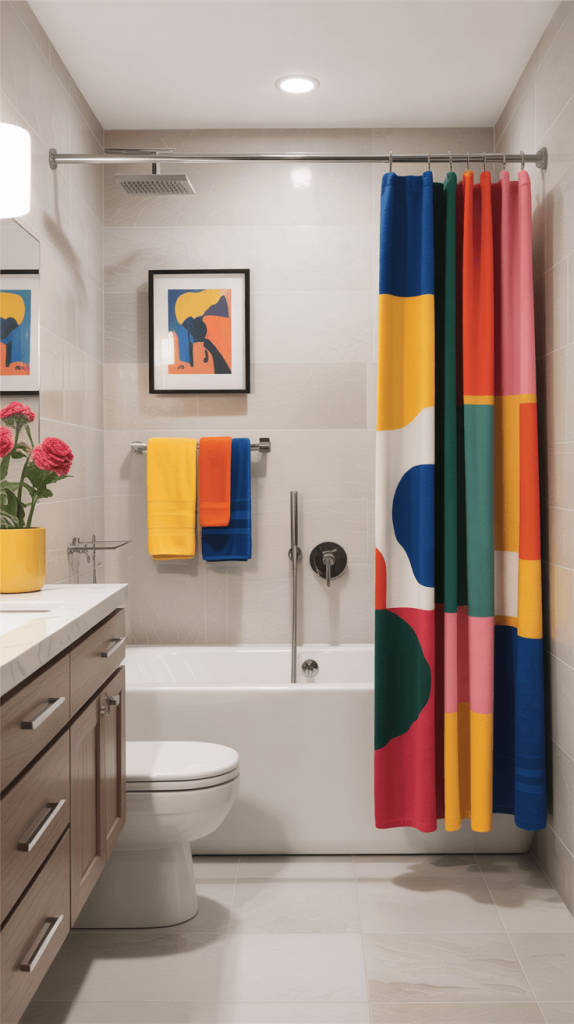 • Accessories: A bright yellow soap dispenser, a stack of coffee table books, or a brightly colored vanity stool.
