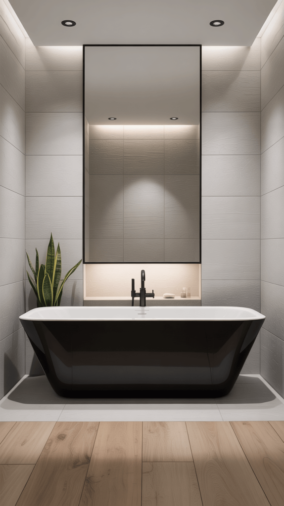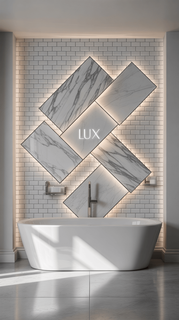 • Unusual Stone or Large Format Slabs: Instead of small tiles, cover an entire wall with a large, dramatic slab of marble or a super-sized porcelain panel with a striking vein pattern. The minimal grout lines create a seamless, luxurious look.