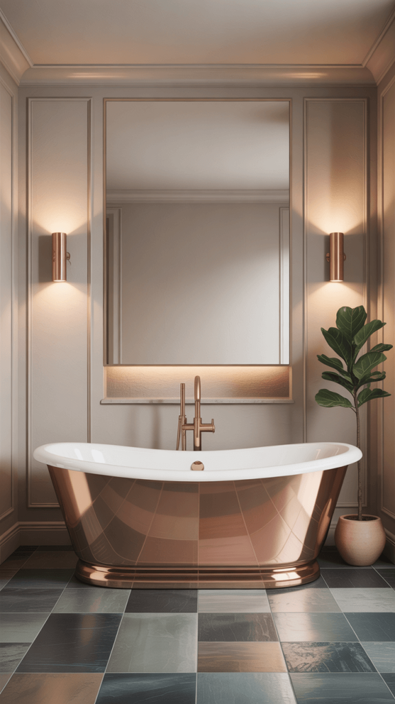 We’ve talked about the power of black fixtures, but let’s not forget the classics with a twist. Metallic accents are the jewelry of your bathroom.