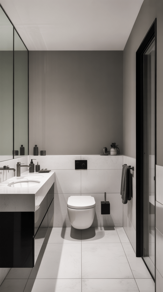 • Play with Pattern: A black and white geometric floor tile paired with solid black fixtures and white walls is a masterclass in modern monochrome.