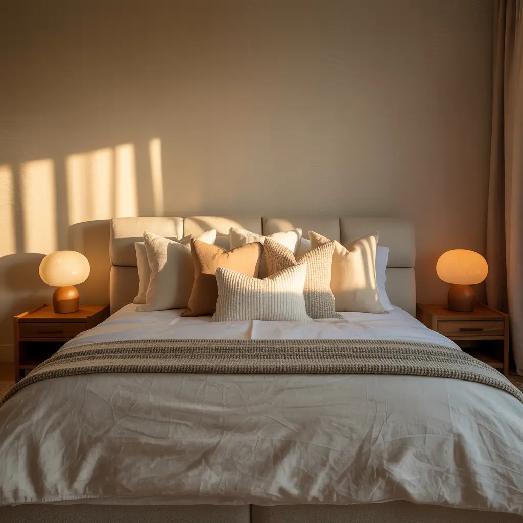 Natural materials elevate this look instantly. Think travertine lamps, wooden furniture with visible grain, and maybe a sheepskin rug that your feet will thank you for every morning.