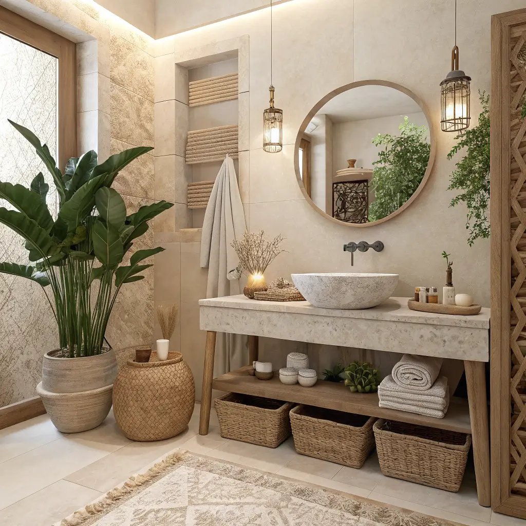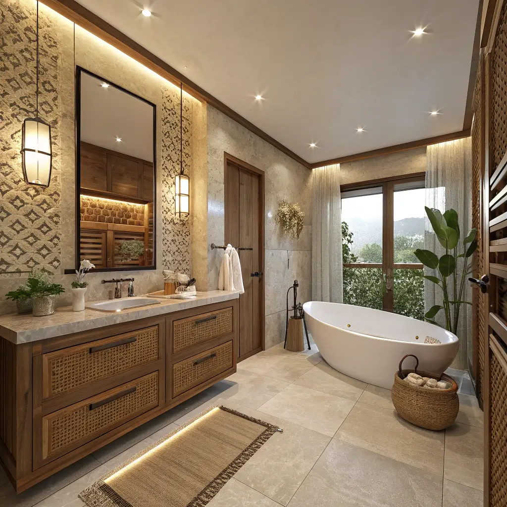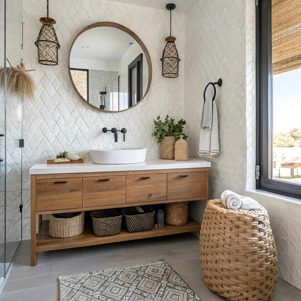 One word of caution from experience: don’t go full rattan overload. Pick two or three rattan pieces maximum. If every surface features rattan, the bathroom starts looking like a tiki bar โ€” and not in the cool, intentional way. Restraint keeps it elevated.