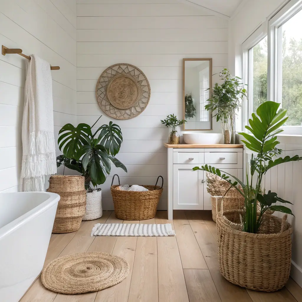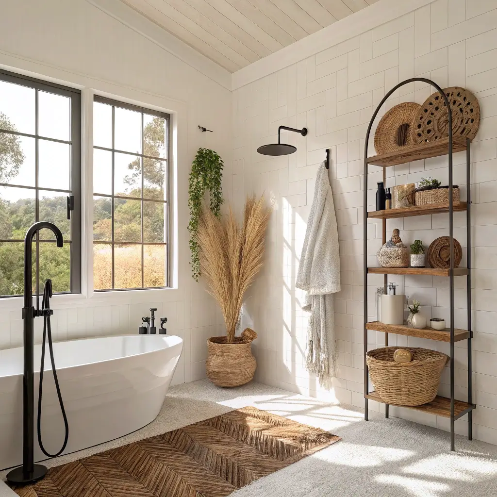 The Scandi-boho crossover is one of the most refined takes on the modern boho bathroom. It merges Scandinavian minimalism โ€” clean lines, functional design, muted colors โ€” with bohemian warmth and texture. The result is a bathroom that feels both polished and lived-in.
