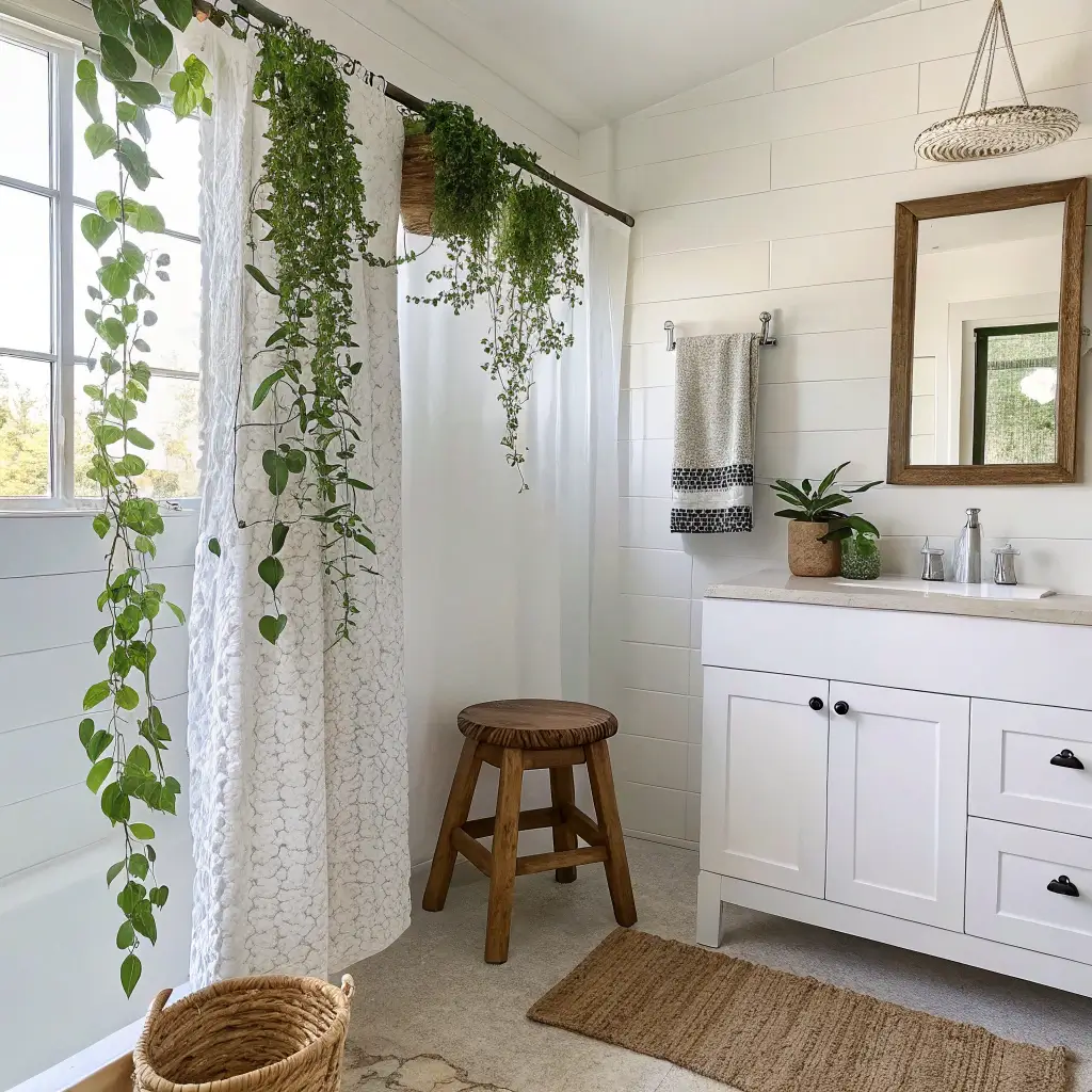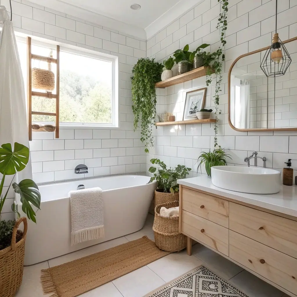 Here’s where things get really fun. Plants transform a minimal bathroom into a living, breathing boho sanctuary, and they cost practically nothing compared to most design upgrades.