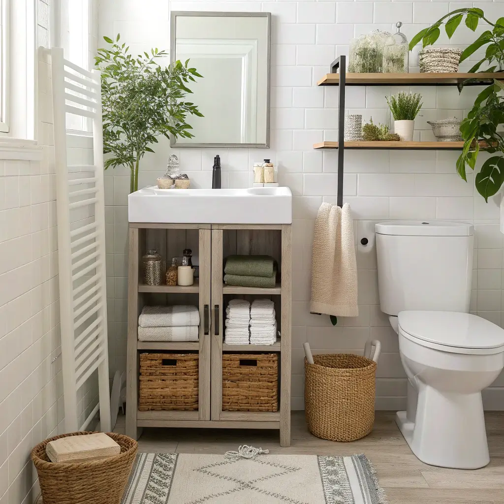 • Go vertical with storageย โ€” tall shelving, wall-mounted baskets, hooks instead of towel bars