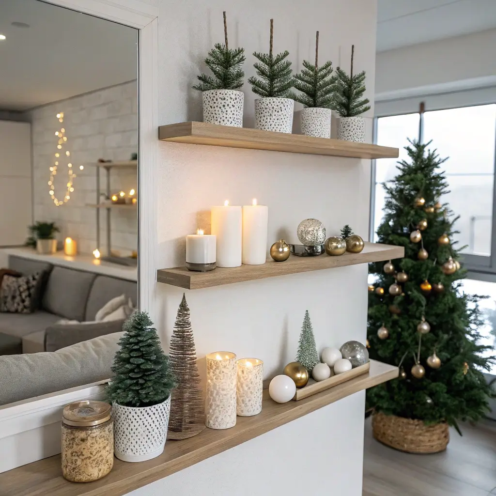 Floating shelves offer the perfect platform for modern Christmas displays. Instead of cluttering every surface, create intentional vignettes on your shelves. I arrange mine in odd numbers – three items per shelf usually works perfectly. Maybe a small metallic tree, a geometric candle holder, and a minimalist snow globe.