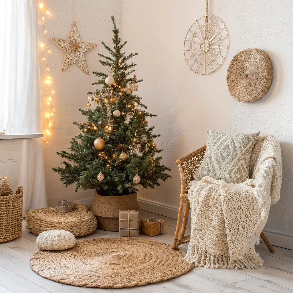 Layer different textures – jute, cotton, wood, and rattan – in shades of cream, beige, and tan. Add fairy lights woven through macramé wall hangings. Place a small tree in a woven basket instead of a traditional tree skirt. The whole vibe says “I’m festive but also very zen about it.”
