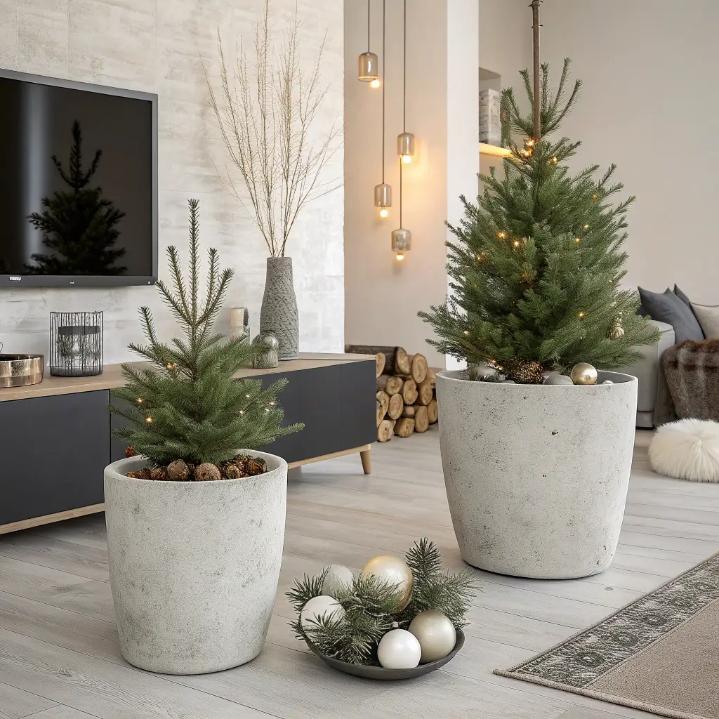 This might sound weird, but concrete and pine create this amazing industrial-meets-natural aesthetic. Concrete planters filled with mini pine trees, concrete ornaments (yes, they exist!), and pine garland draped over concrete or metal furniture pieces bring unexpected sophistication.