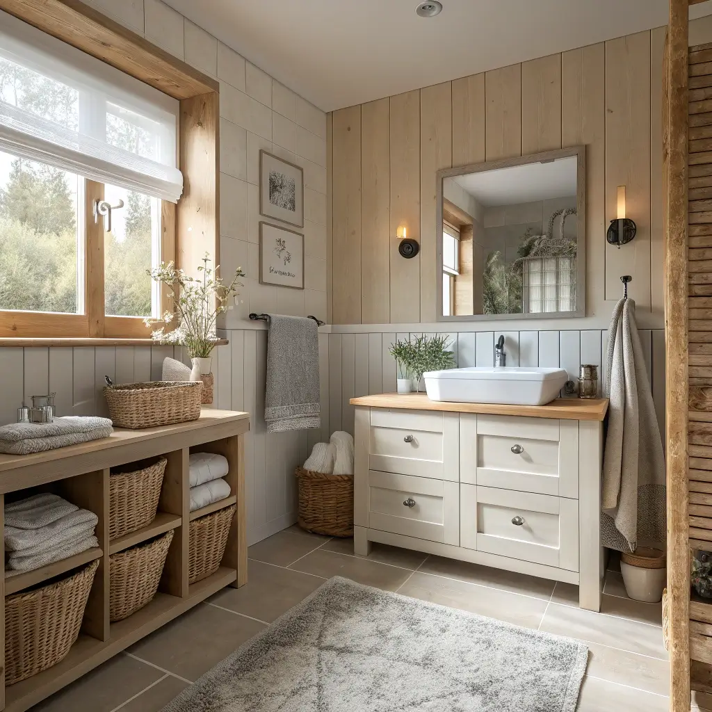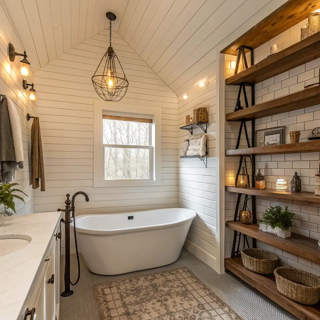 The minimalist cottage look relies on a “less but better” philosophy. Choose one stunning wooden stool instead of three mediocre accessories. Install floating shelves that barely whisper their presence rather than bulky cabinets that dominate the room. Your bathroom should breathe, not suffocate under decorative overload.