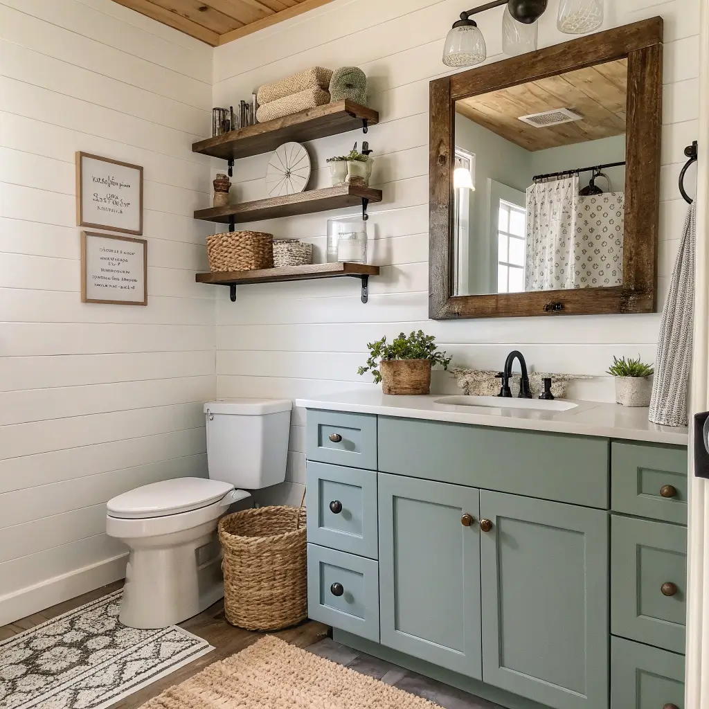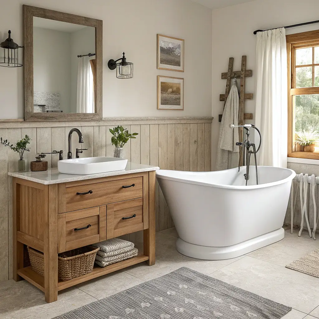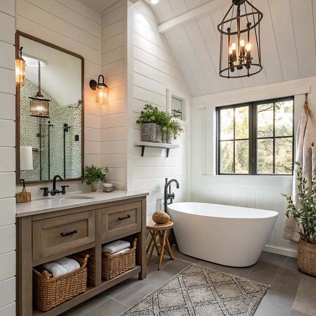 The beauty of this style lies in its flexibility. Mix high and low, old and new, rustic and refined until you find the combination that feels like home. Whether you’re working with a massive primary bath or a tiny powder room, these ideas scale to fit your space and budget.