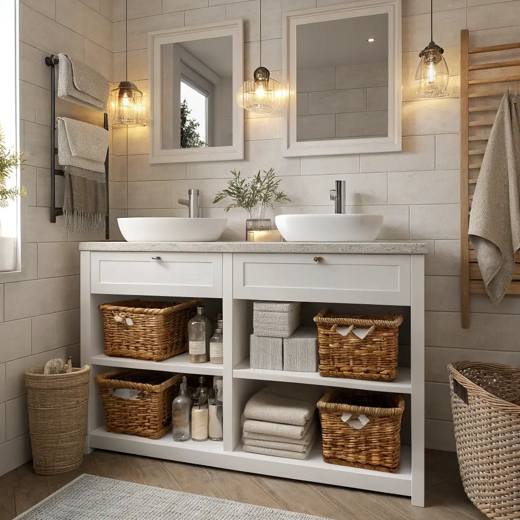 Let’s be real – cottage charm disappears fast when your countertop looks like a beauty supply store exploded. Smart storage solutions keep the aesthetic intact while hiding all those products you definitely need but don’t want on display.