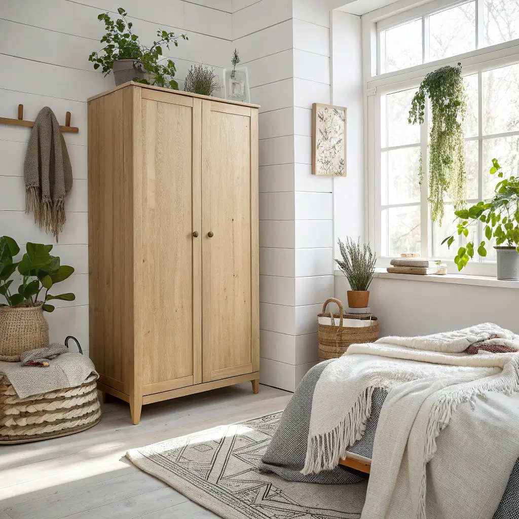Scandinavian cupboards focus on functionality without sacrificing beauty. Think light woods, clean lines, and clever internal organization. The color palette stays neutral – whites, greys, and natural wood tones – creating this calming atmosphere that makes your bedroom feel like a retreat.