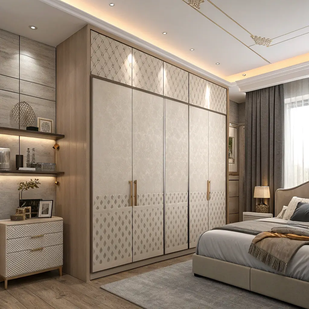 Last but definitely not least, geometric panel wardrobes are for those who want their storage to double as art. These designs use angular patterns, asymmetrical divisions, and creative panel arrangements to create visual interest that goes way beyond basic storage.