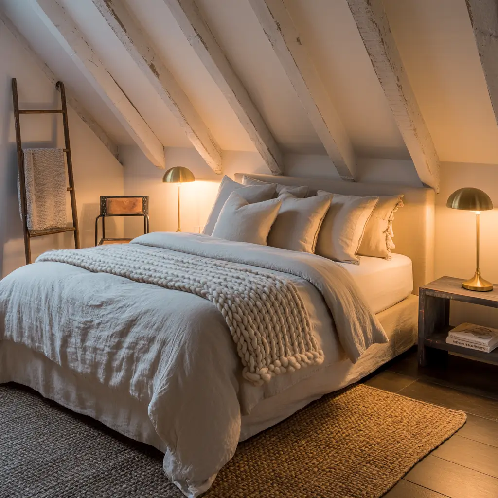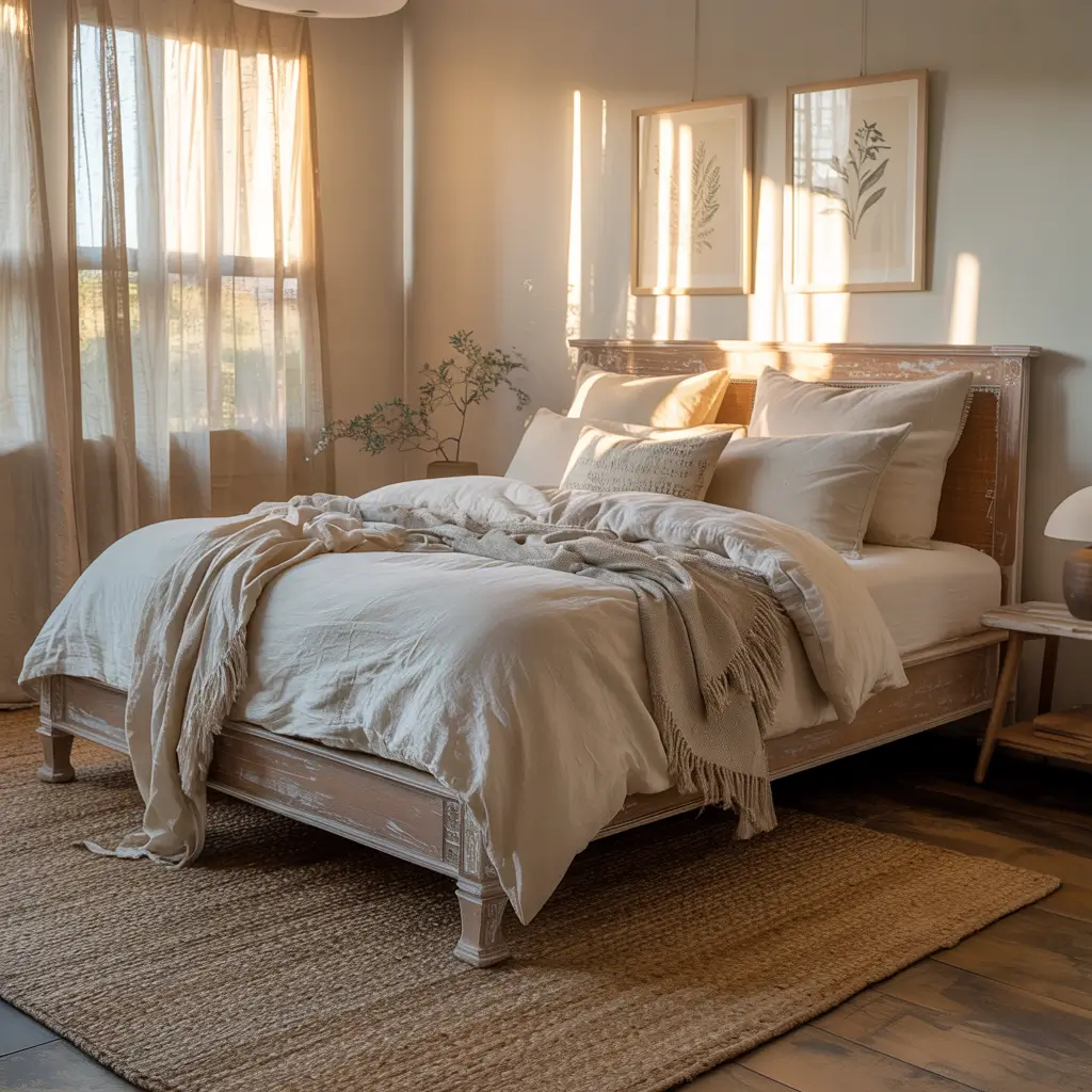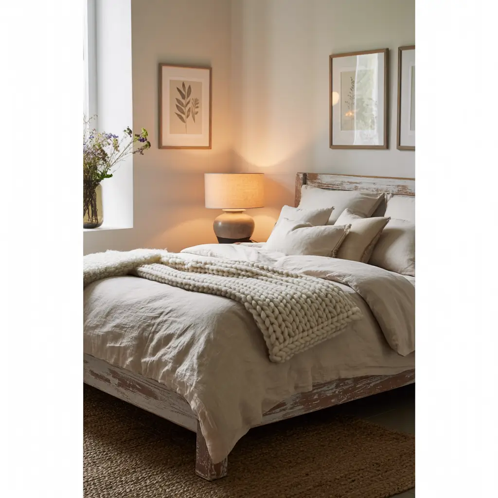 Start with crisp white walls as your canvas. Then layer in natural linen bedding in oatmeal or flax tones. Add a chunky knit throw in cream, some weathered wood nightstands, and maybe a jute rug to ground the space. The magic happens when you mix materials – think soft cotton meeting rough wood, smooth metal hardware against nubby fabrics.
