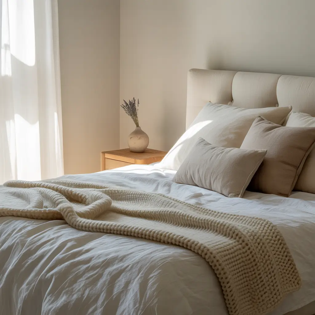 The pillow situation needs strategy. Two sleeping pillows, two to four Euro shams against the headboard, then decorative pillows in front. Mix textures like linen, cotton, and maybe a cable knit or two. But here’s my hot take: skip the tiny decorative pillows that serve no purpose except falling on the floor.
