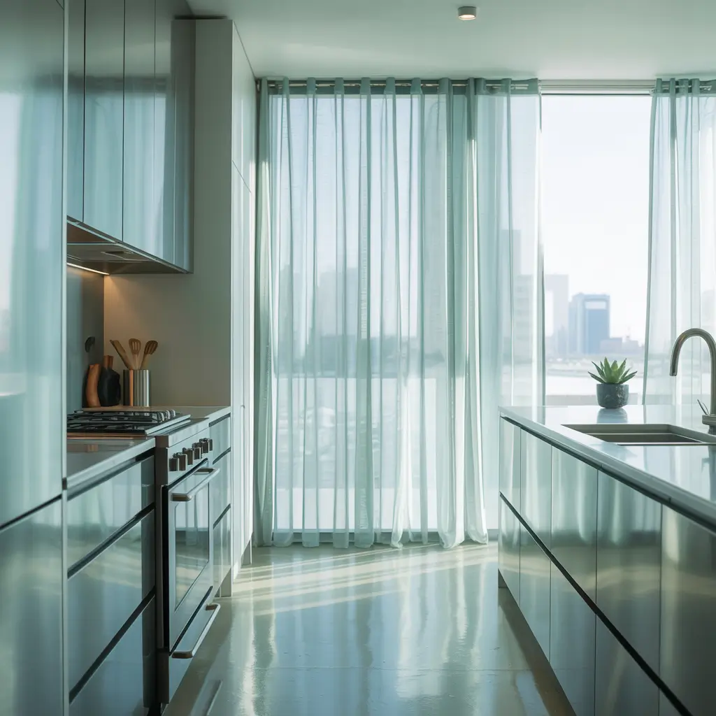 Metallic grommet curtains bring a touch of glamour without going full-on Vegas. The metal rings create smooth, uniform pleats that look incredibly polished, while metallic fabrics add subtle shine that elevates your entire kitchen.
