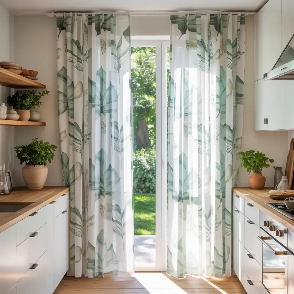 Last but definitely not least, botanical print curtains bring the outdoors in without the maintenance of actual plants. Whether you choose delicate ferns, bold tropical flowers, or abstract leaf patterns, botanical prints add life to any kitchen.