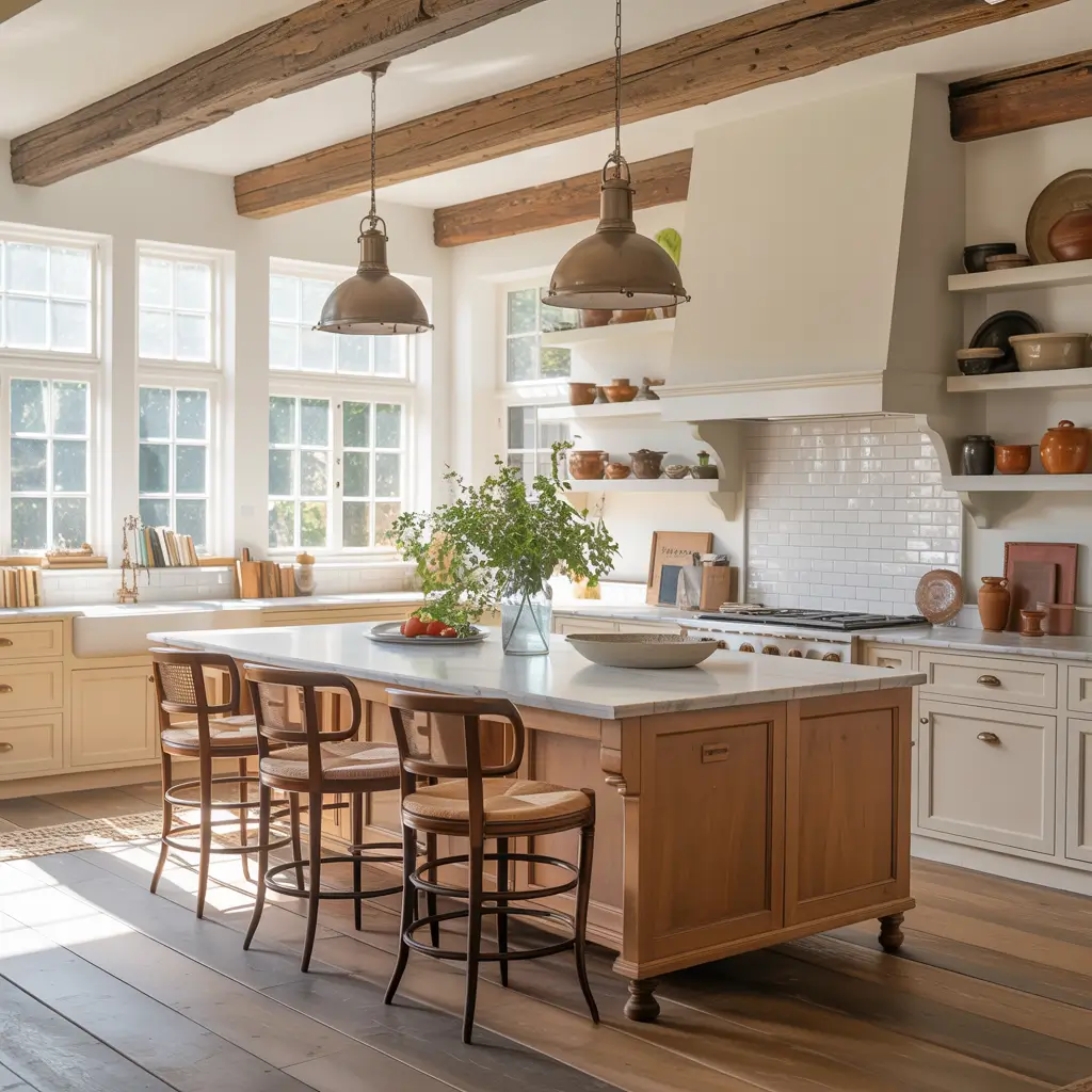 - Reclaimed wood elements for the island or open shelving