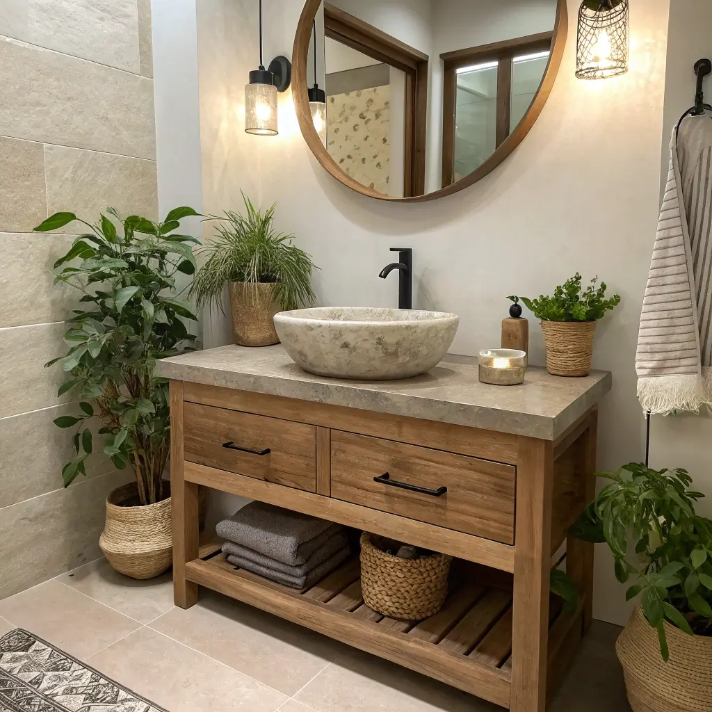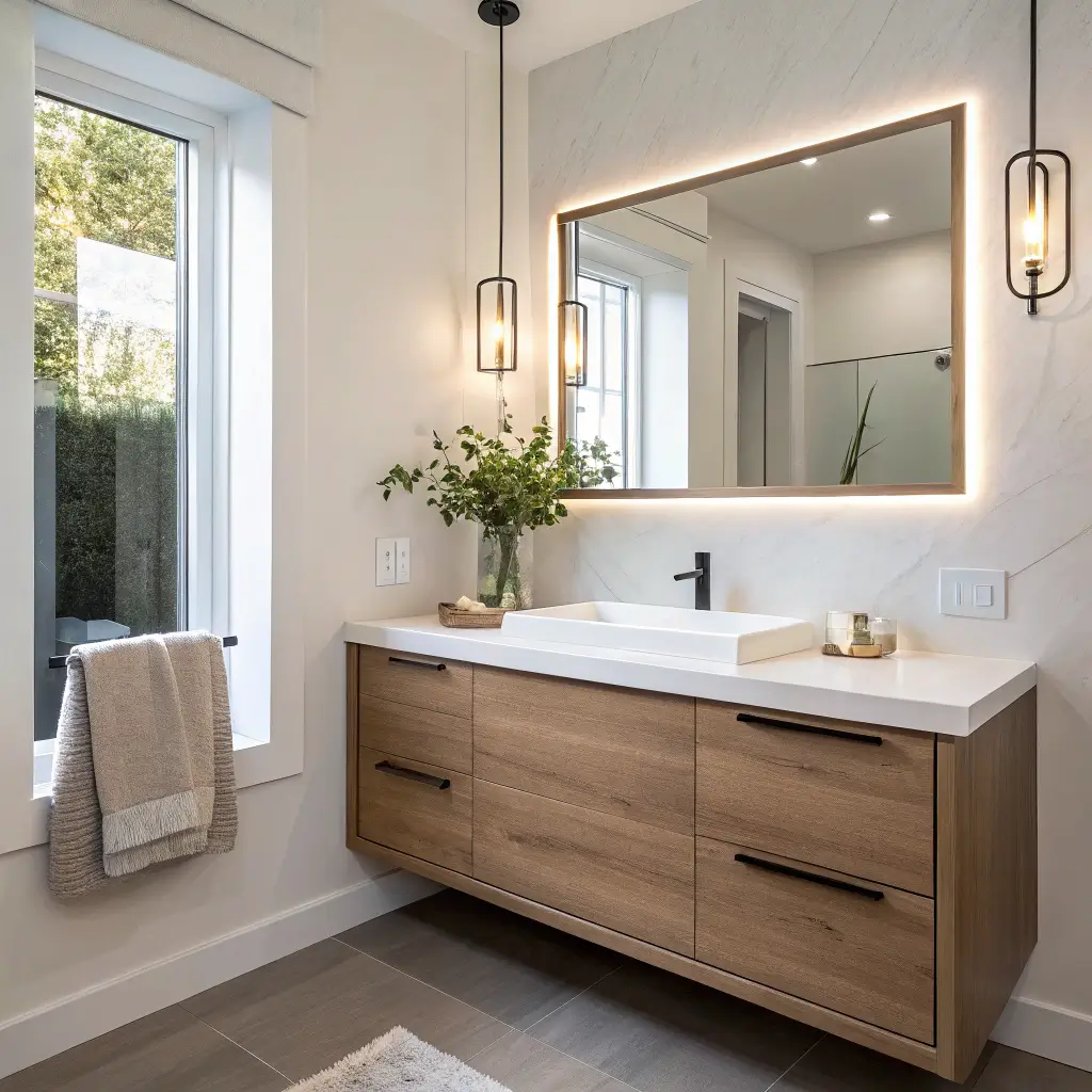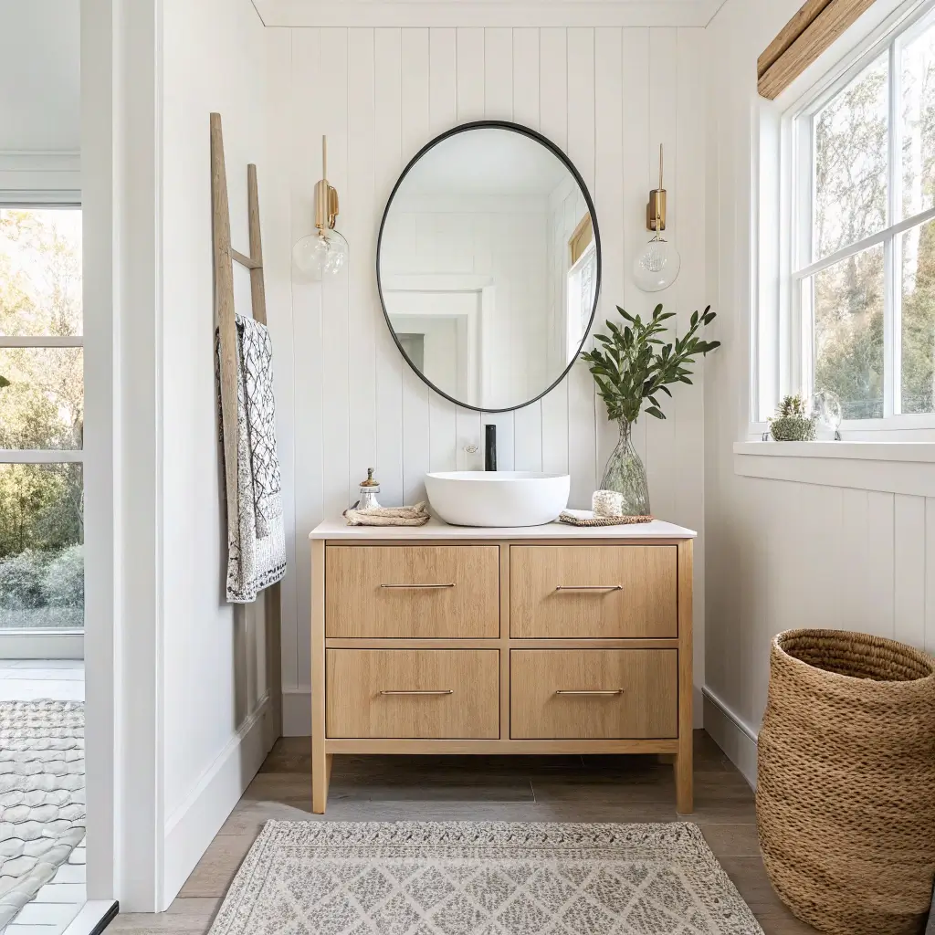 Remember, minimalist doesn’t mean boring. Play with shapes through your mirror choice or add a single piece of abstract art. The key is restraint – choose one statement element and let everything else support it.
