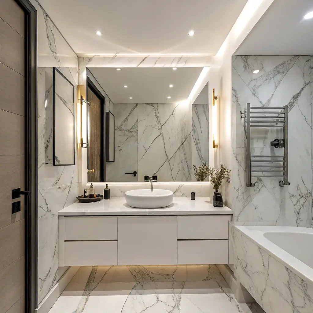 The trick to keeping a marble accent wall modern rather than grandma’s-house-circa-1987 is all in what you pair it with. Think sleek black fixtures, minimalist accessories, and geometric mirrors. The contrast between the organic marble patterns and sharp, modern lines creates that perfect tension that makes a space interesting.