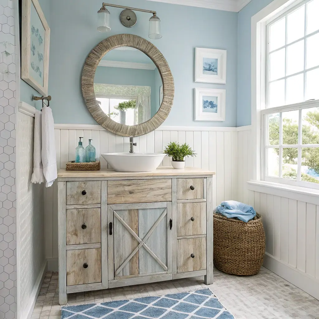 Skip the nautical rope and sailboat art. Instead, incorporate natural materials like rattan, jute, or weathered wood. A driftwood-framed mirror or woven baskets for storage bring in that coastal texture without the cheese factor.