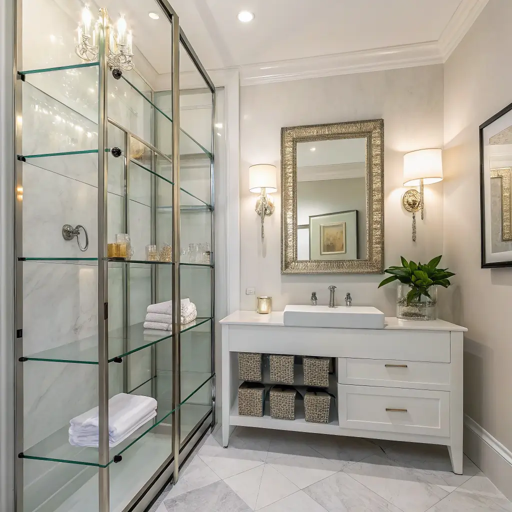Open shelving in glass and metal creates an airy, modern look that’s perfect for powder rooms. The transparency of glass keeps things feeling light, while metal frames add structure and style. This setup forces you to keep things tidy, which honestly, we all need that accountability.