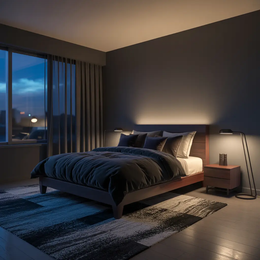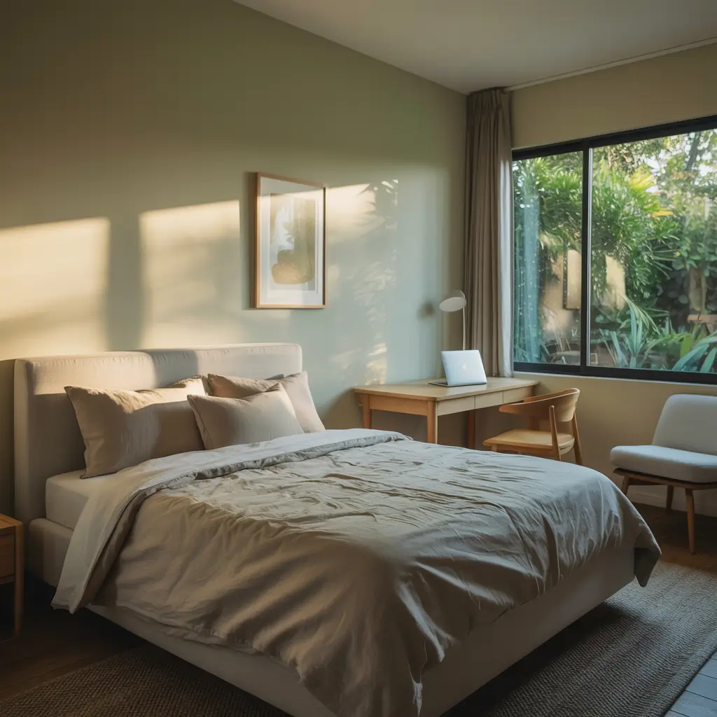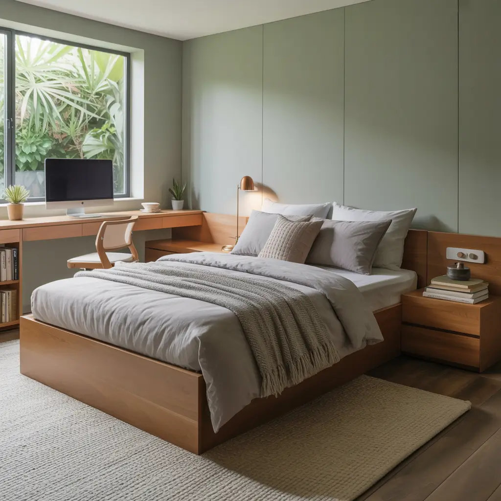 The bedroom area stays calm and sleep-focused. Blackout curtains ensure quality rest, while keeping electronics on the desk side prevents midnight scrolling. It’s about creating boundaries within one space.