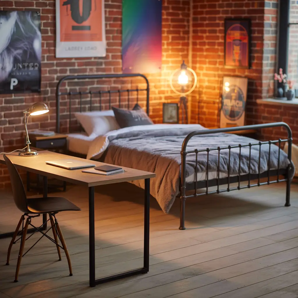 Exposed brick wallpaper (or actual brick if you’re lucky) sets the foundation. Mix in metal furniture pieces – think black metal bed frames and wire mesh storage units. The color palette stays masculine with grays, blacks, and browns, but throw in some Edison bulb string lights to soften the harshness.