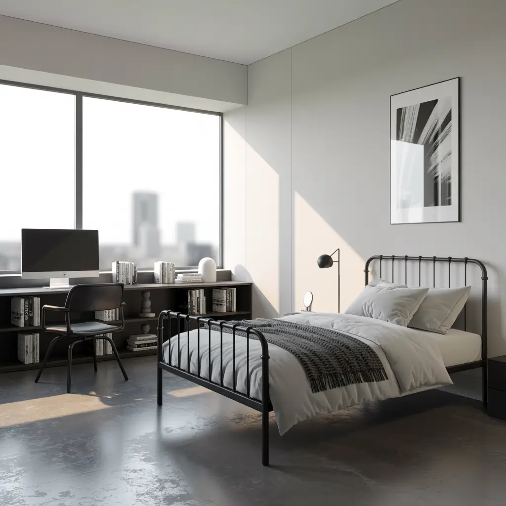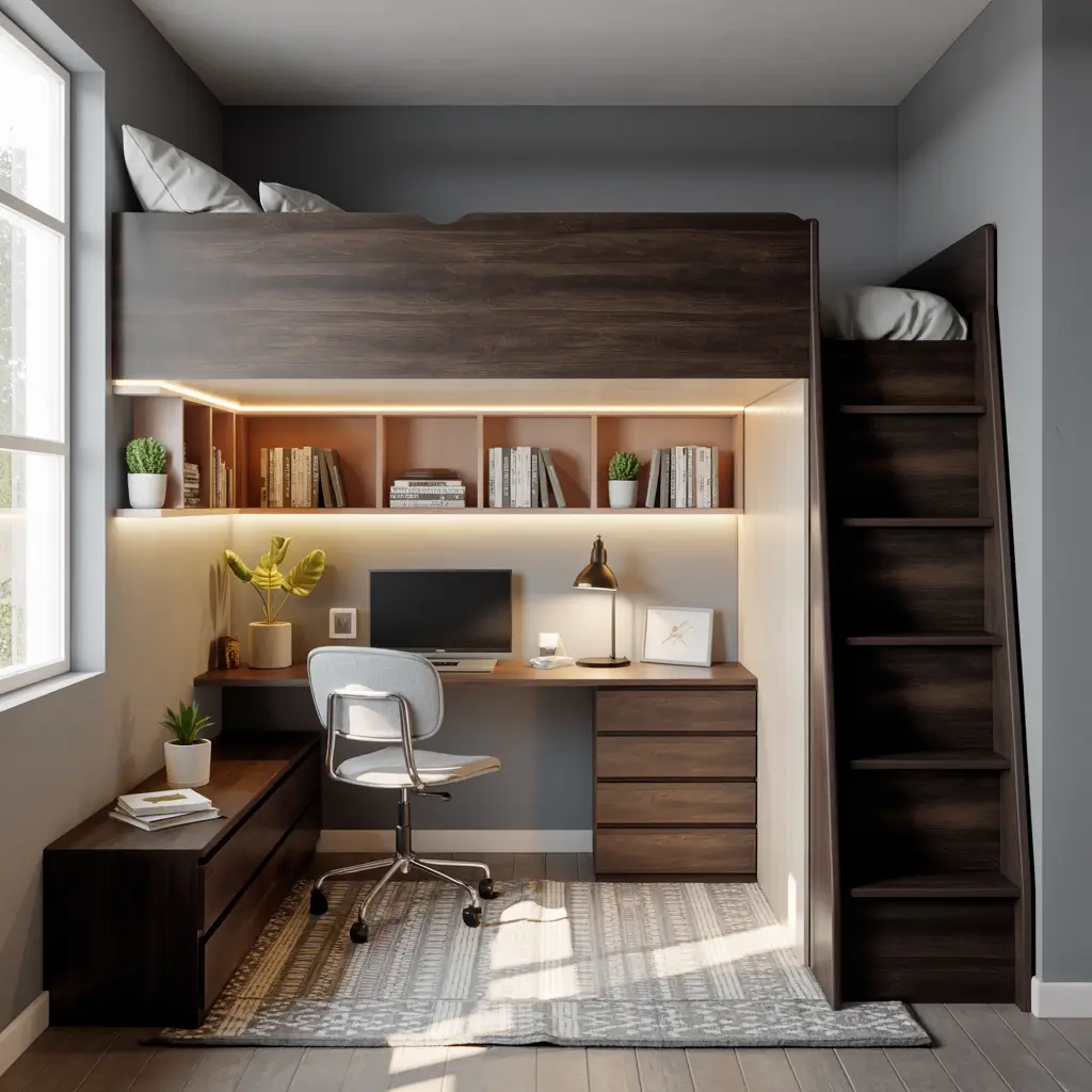 Vertical space becomes your best friend here. Loft beds free up the entire floor underneath for a desk or seating area. Wall-mounted everything – desks, shelves, even bedside tables. That floor space stays clear for actual movement. I once fit a complete bedroom, study area, and gaming setup in a 10×10 room using these principles.