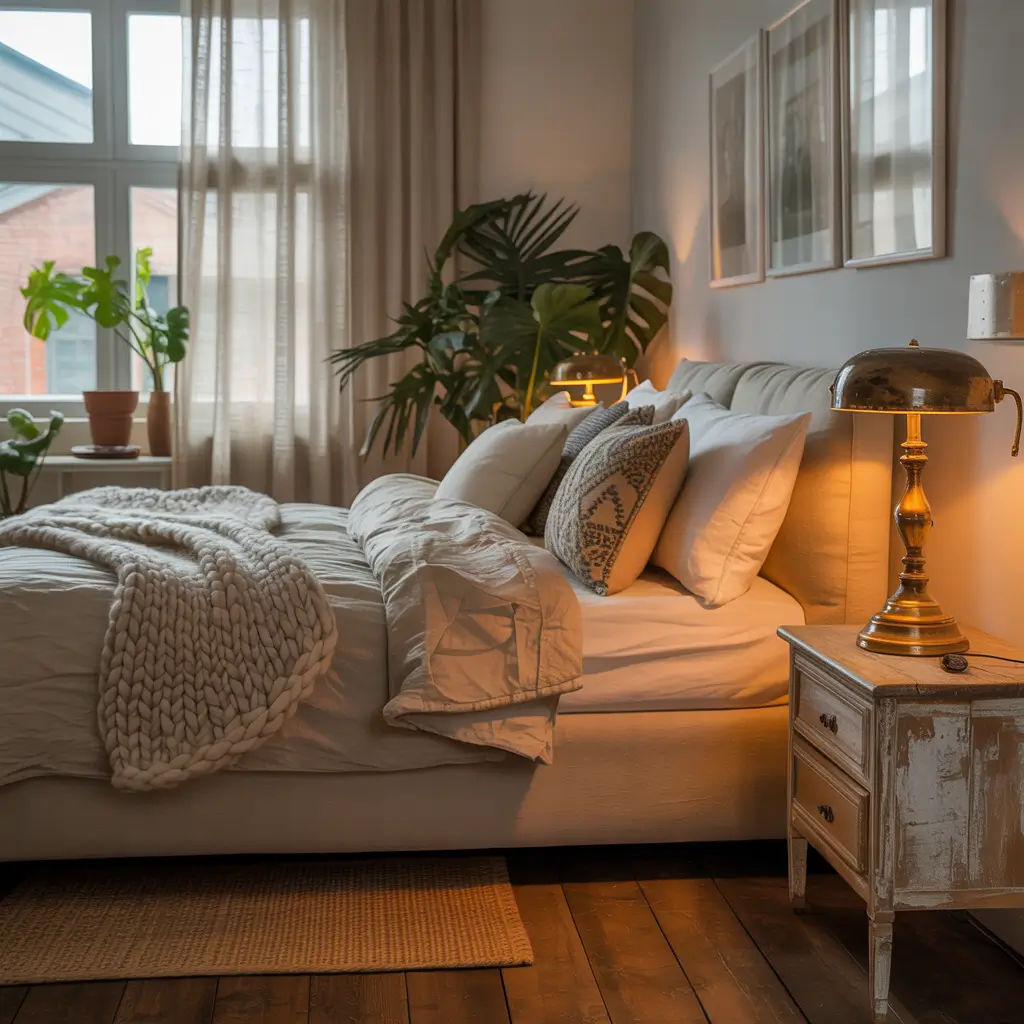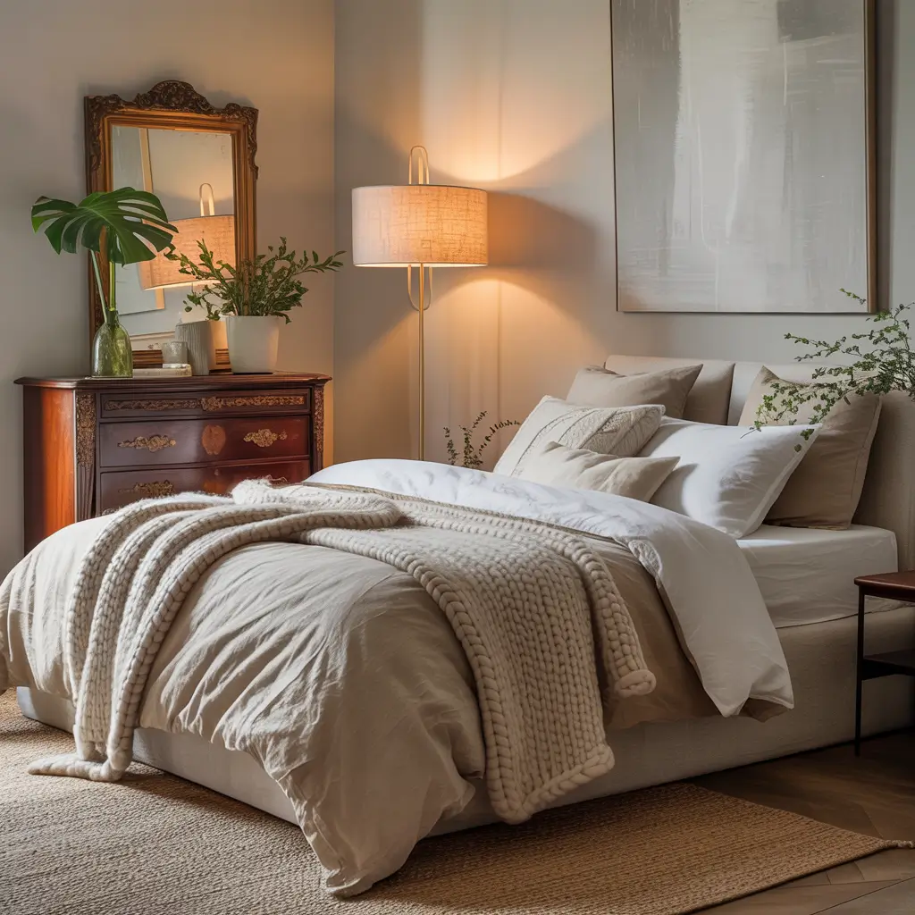 My favorite combination? A traditional wooden bed with modern metal accents, dressed in natural linen with velvet pillows and a chunky knit throw. The mix of old and new textures creates visual interest without relying on busy patterns.