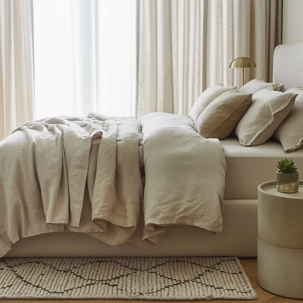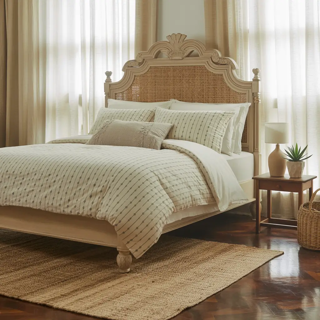 Bedding might be the easiest place to start mixing styles. Crisp, modern bedding makes traditional furniture feel fresh, not fussy. Think hotel-style white sheets on a carved wooden bed, or geometric patterns on a tufted headboard.