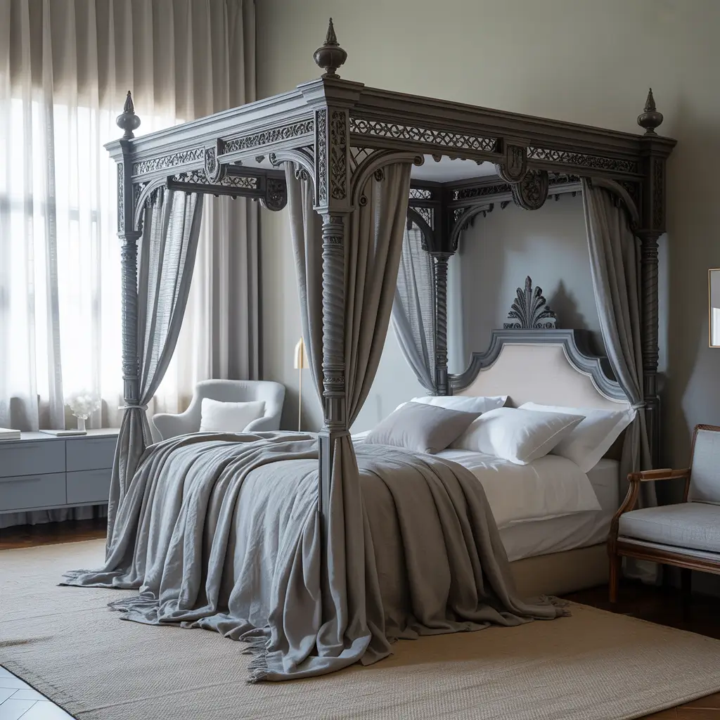 Remember those heavy, draped canopy beds that looked like they could survive a siege? We’re not doing that. Modern Victorian canopy beds feature simple metal or wood frames with minimal or no fabric draping.