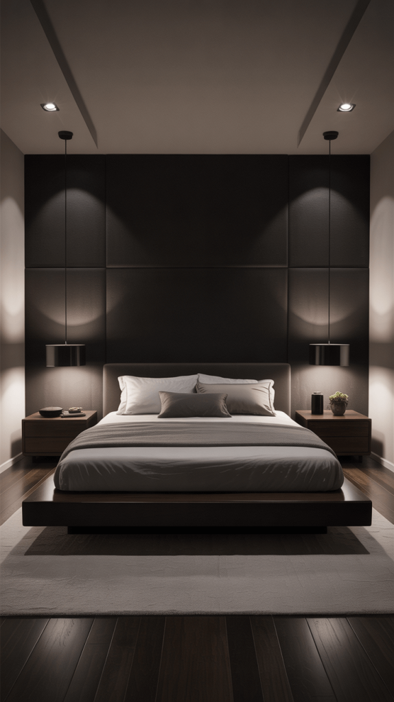 - Floating Nightstands: Instead of bulky nightstands, install wall-mounted, floating shelves or small cabinets in a dark wood or matte black finish. This literally frees up floor space, making the room feel airier.