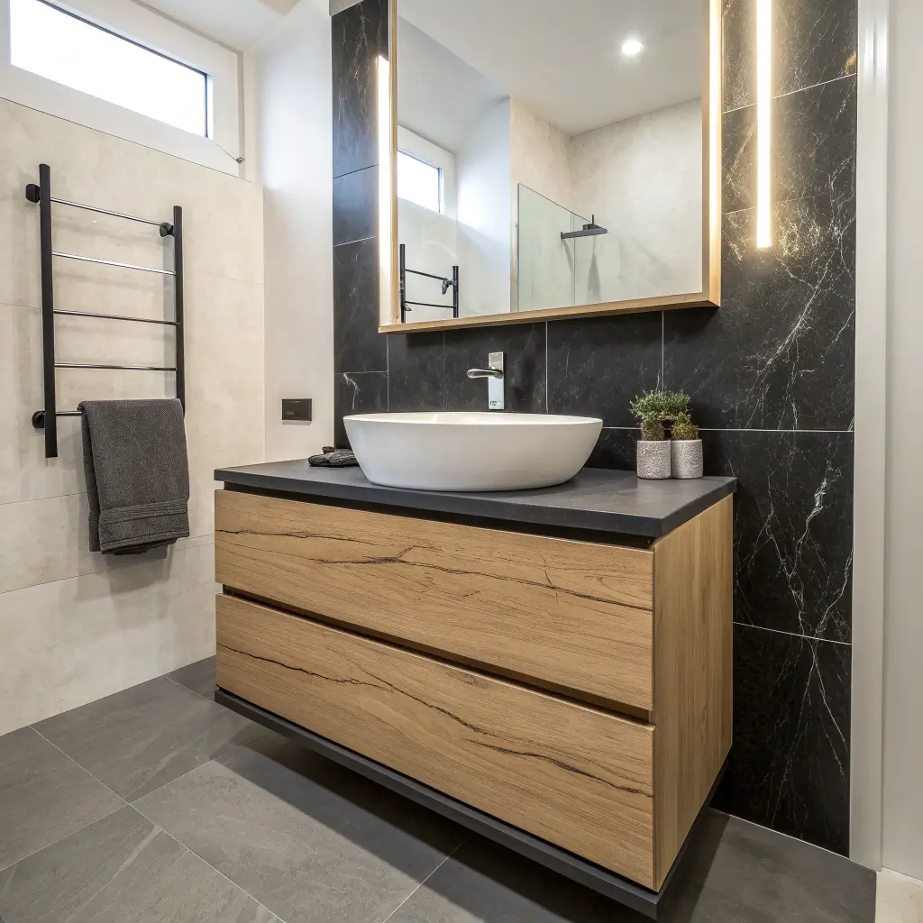 Here’s something I learned the hard way: in small bathrooms, the finish matters even more. Lighter woods like ash or blonde oak reflect light and make the space feel larger. Save those dramatic dark walnuts for bigger rooms where they won’t feel oppressive.