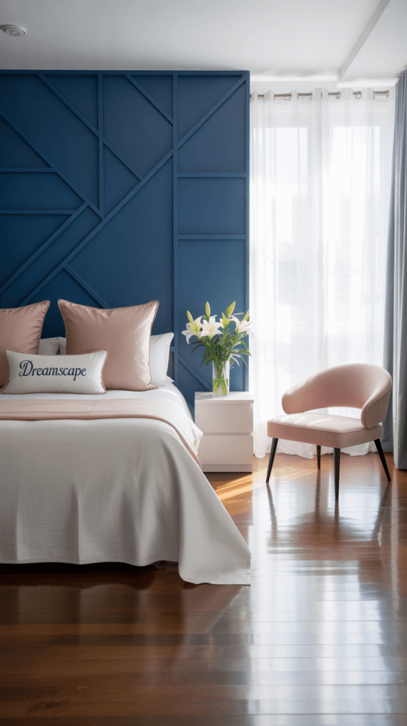 2. Modern Navy Blue and Pink Accent Wall Bedroom
