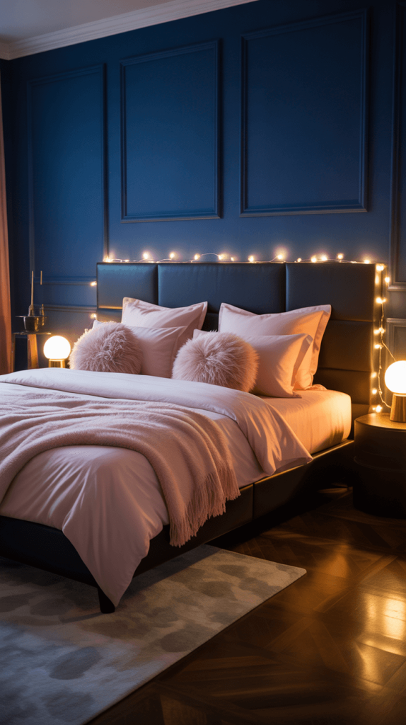 12. Navy Blue and Pink Bedroom with Soft Lighting