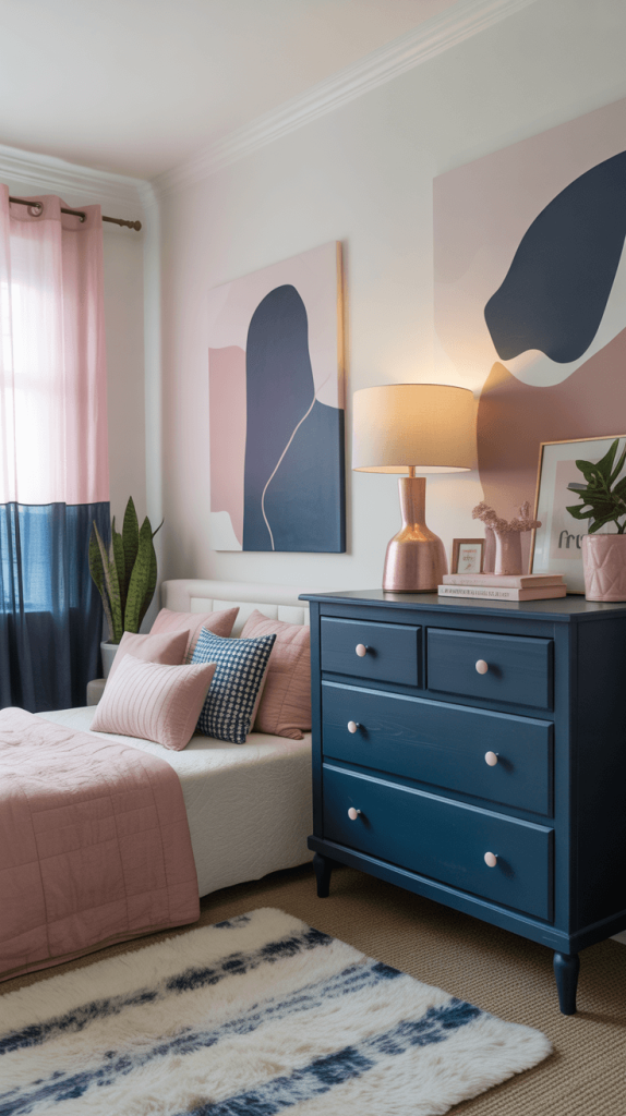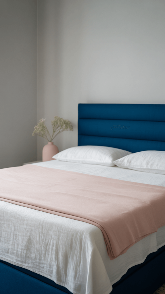 The mantra here is “less is more, but make it impactful.” You might paint all your walls a serene, light grey and bring in a single, stunning navy blue headboard. Or, choose a navy bed frame and keep everything else muted. Your pink accents become tiny, deliberate moments of joy: a single pink ceramic vase on a nightstand, a minimalist pink abstract print in a thin black frame, or a neatly folded pink blanket at the foot of the bed.
