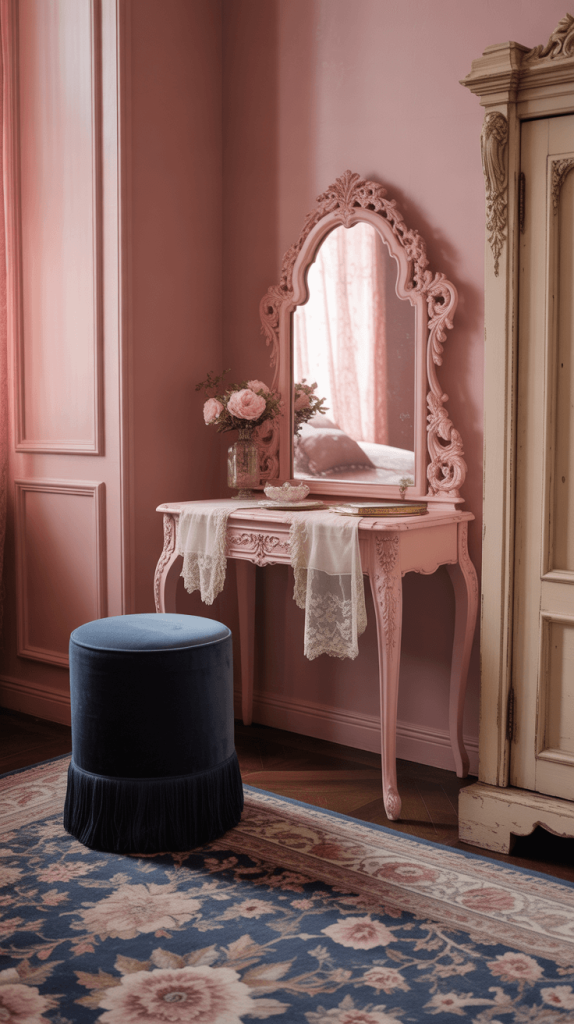 Your colors here should feel a bit faded and timeworn. Think of a dusty rose and a faded denim blue rather than a sharp navy and neon pink. Hunt for unique pieces at flea markets or antique stores: an ornate pink-tinted mirror, a navy velvet vanity stool, an old luggage rack repurposed as a bedside table.