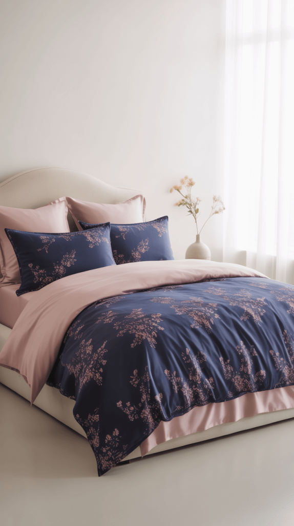 - Botanical Prints: A navy duvet cover with large, sketched pink flowers feels artistic and fresh.