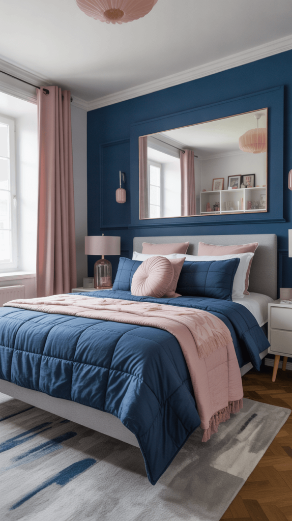 1. Cozy Navy Blue and Blush Pink Bedroom