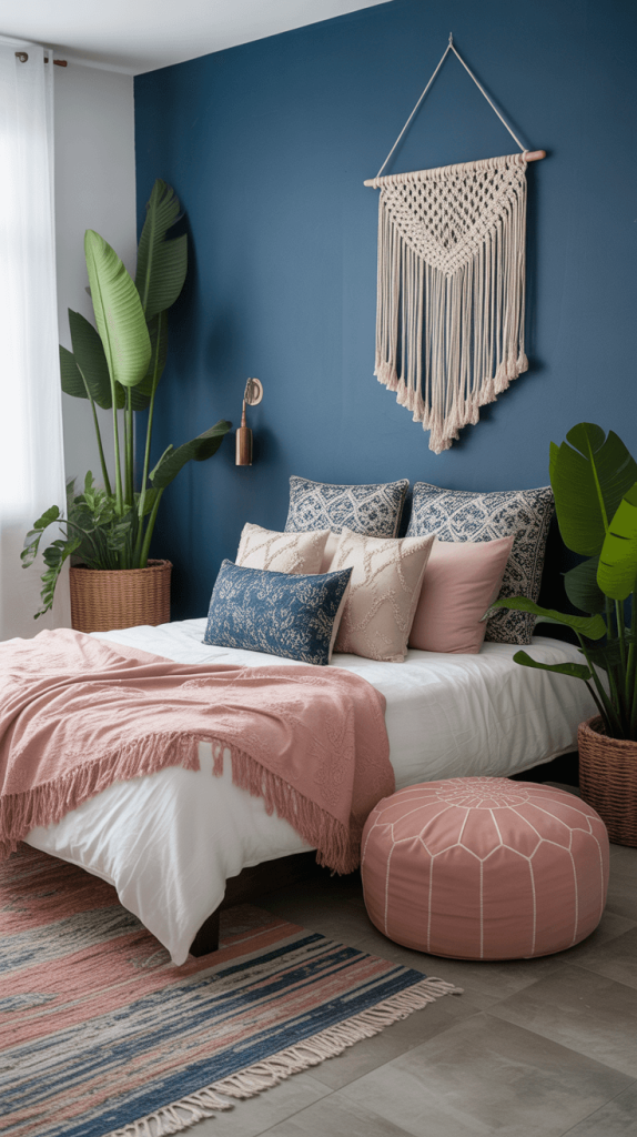6. Navy Blue and Pink Boho Chic Bedroom
