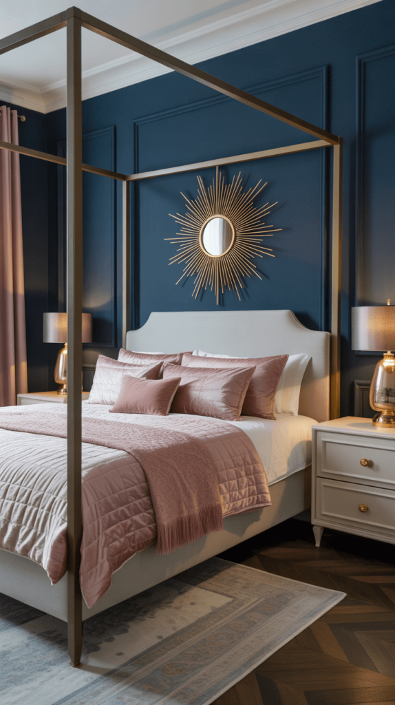 8. Elegant Navy Blue and Pink Bedroom with Gold Accents