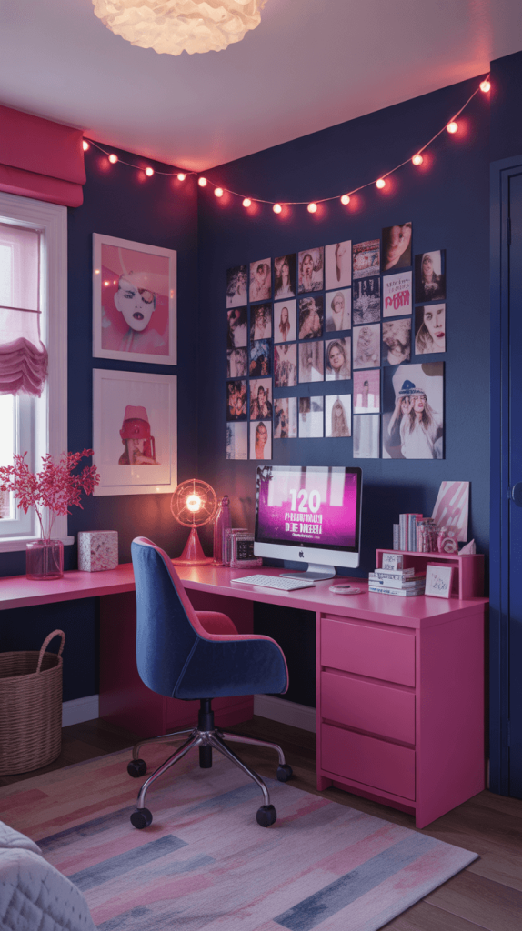 Involve them in the process! Let them choose the specific shades. Maybe they’re into a more vibrant hot pink rather than a blush. Awesome! Use that as the energizing accent against more stable navy elements. This is a great space for fun wall art, photo collages, and trendy decor like LED lights or neon signs.
