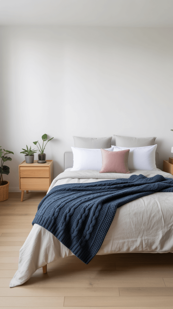 A classic Scandi base is white walls, light wood floors (think oak or ash), and simple, functional furniture. Now, introduce your navy and pink through soft furnishings. A chunky navy knit throw draped over the bed, a single pink pillow on a simple linen duvet cover, a small navy rug beside the bed.