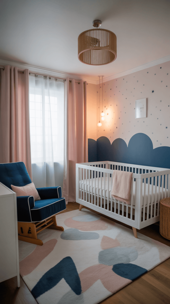 You want the room to be a calm environment for both baby and you. Opt for softer shades: a powdery blue and a gentle blush pink. A navy accent wall behind the crib can be stunning, but make sure the rest of the room is light and bright. Wallpaper with a subtle navy and pink pattern (like tiny stars or clouds) is also a gorgeous option.