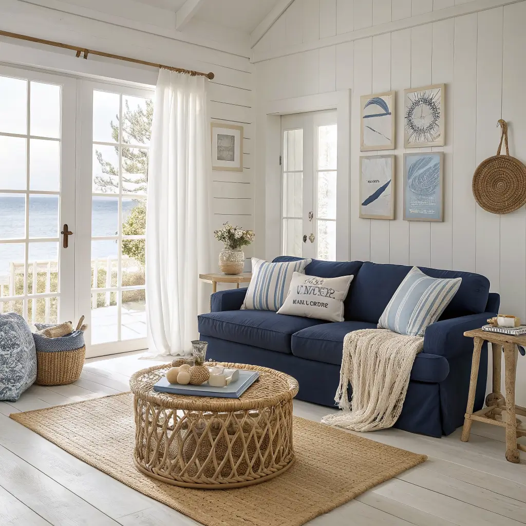 Picture this: you walk into your living room and instantly feel like you’re at a beachside cottage. That’s the magic of pairing your navy couch with coastal-inspired decor. The deep blue naturally echoes the ocean, making this style combo almost foolproof.