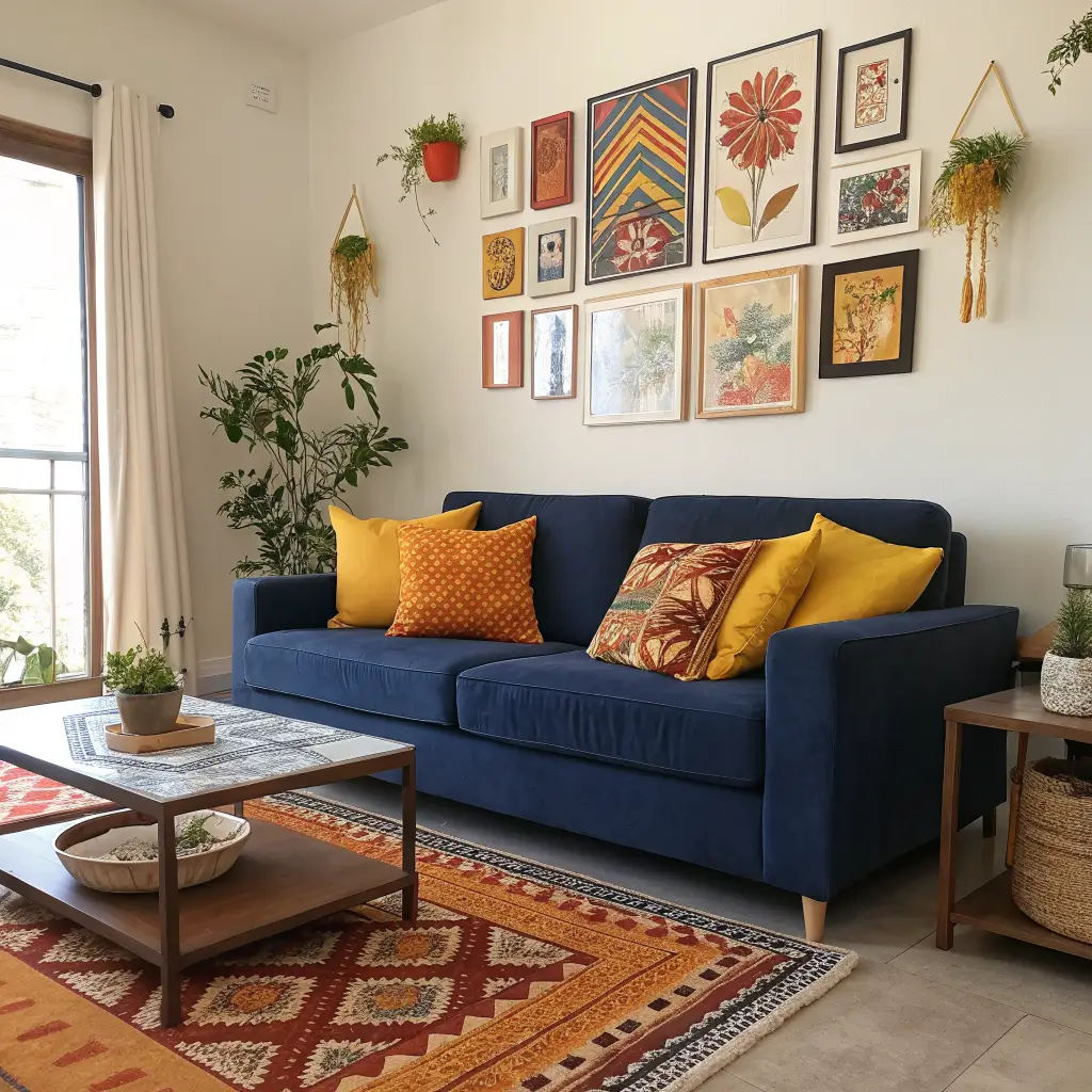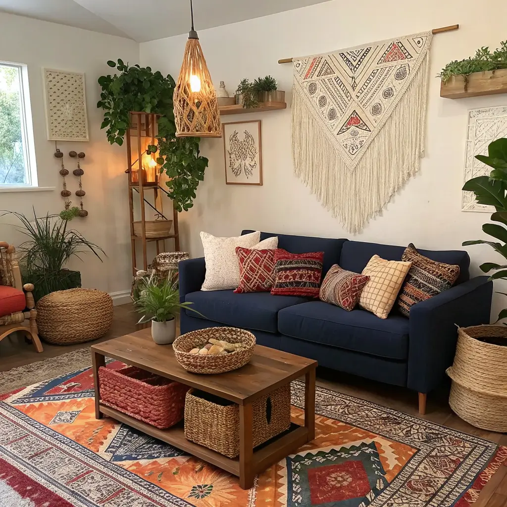 Ready to embrace your inner free spirit? Your navy couch makes the perfect grounding element for all those boho layers you’re dying to add. This style lets you break rules and mix patterns like nobody’s business.